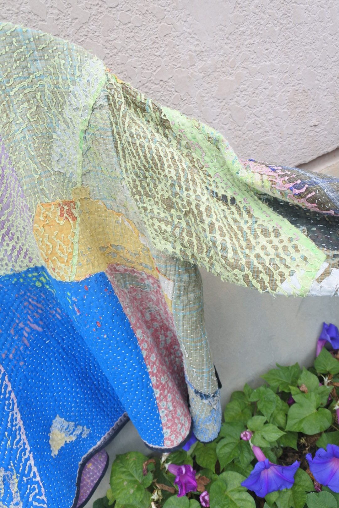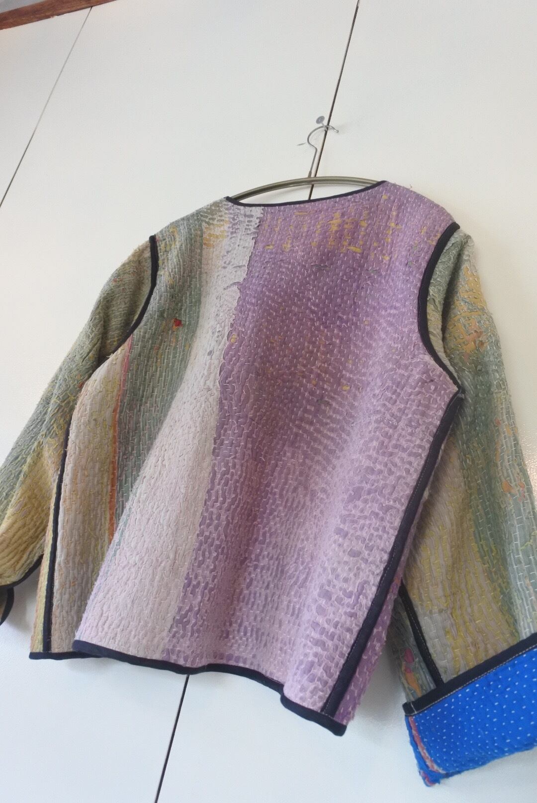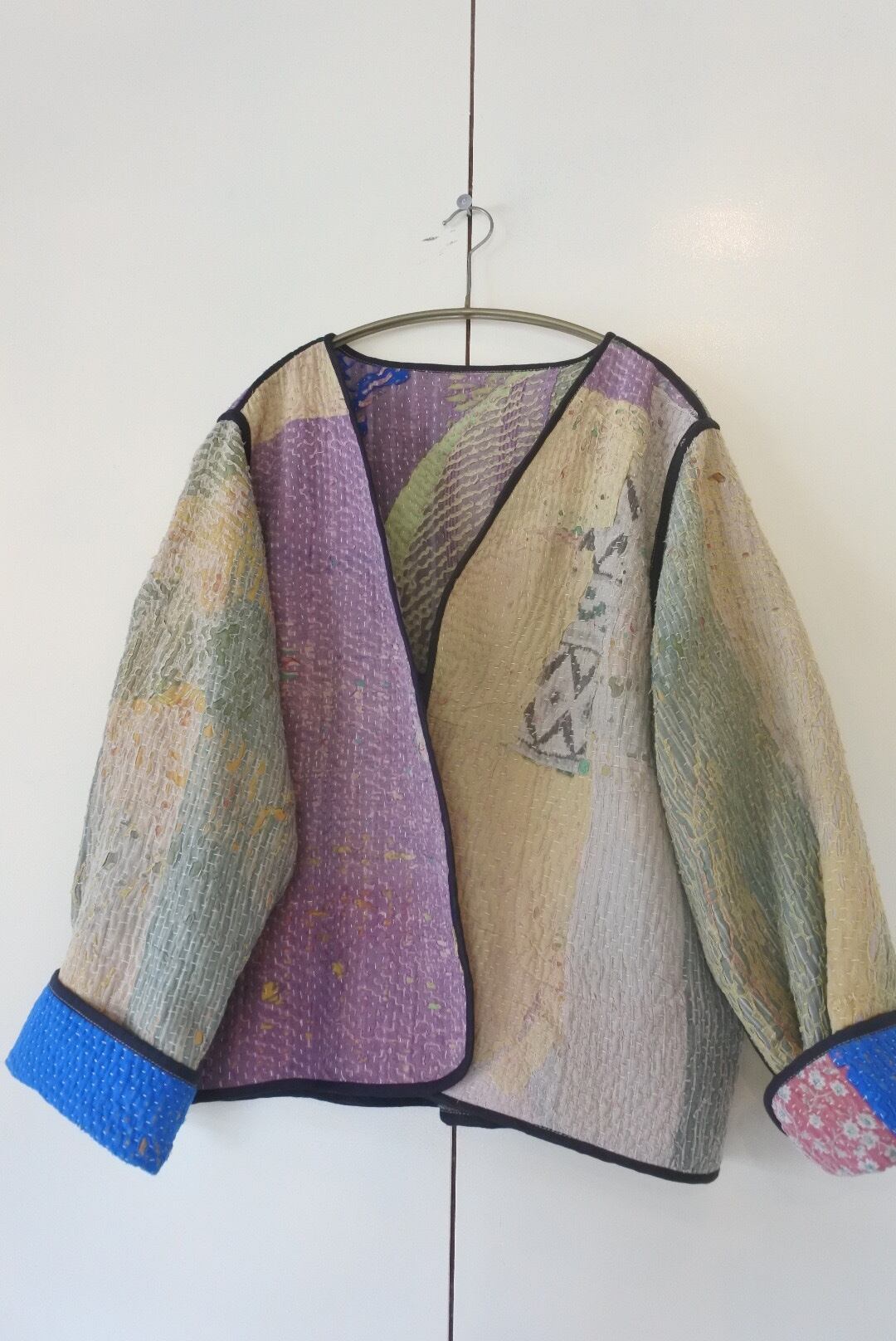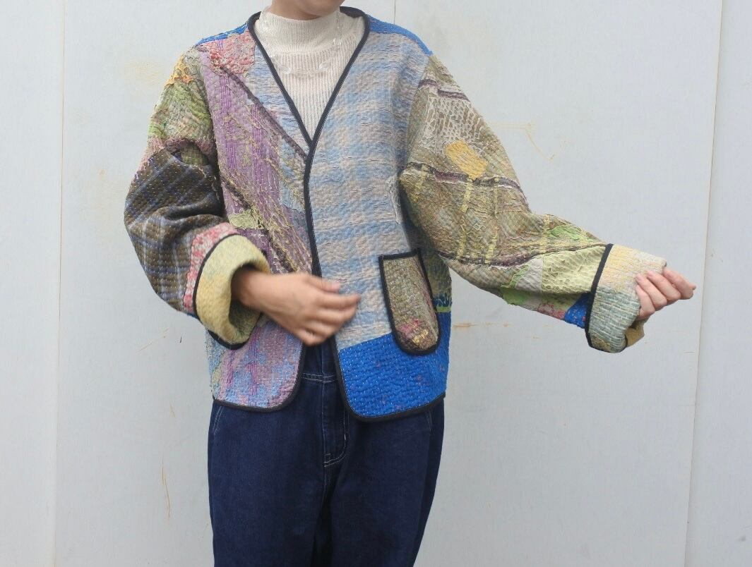 オーロラカラーのヴィンテージカンタジャケットです。 ハッキリとした青や花柄生地のパッチワークなど遊び心がたっぷり詰まった1着です。 こちらはリバーシブル使用となっており 裏も表もお楽しみいただけます。 身幅60㎝ 着丈60㎝ モデル160㎝ コットン100%