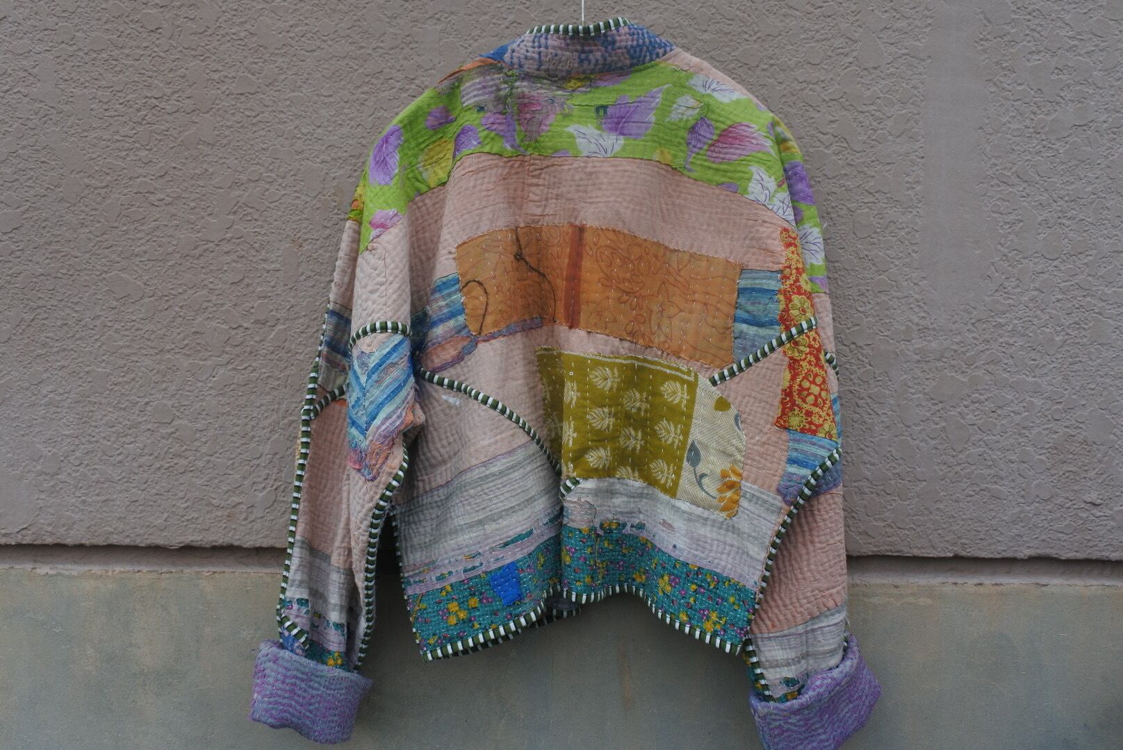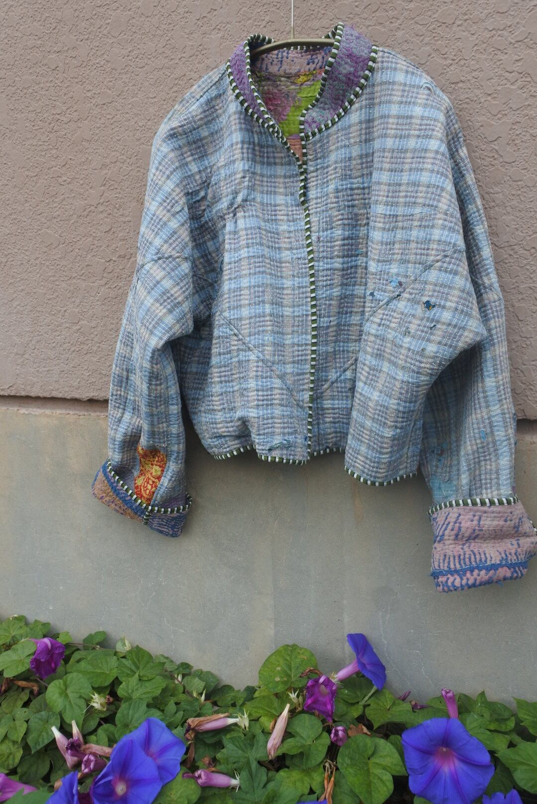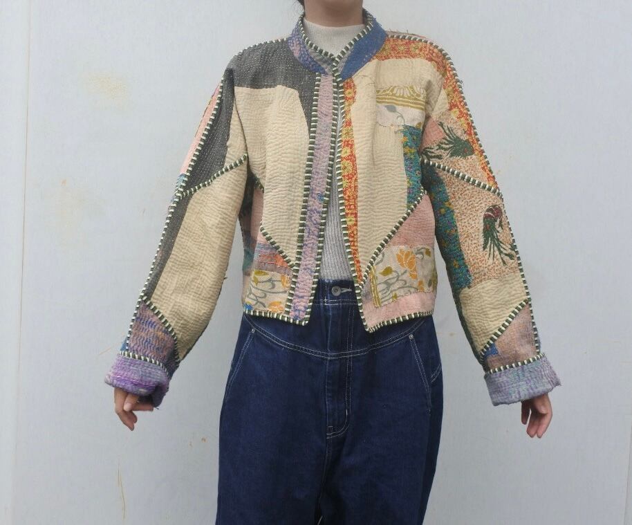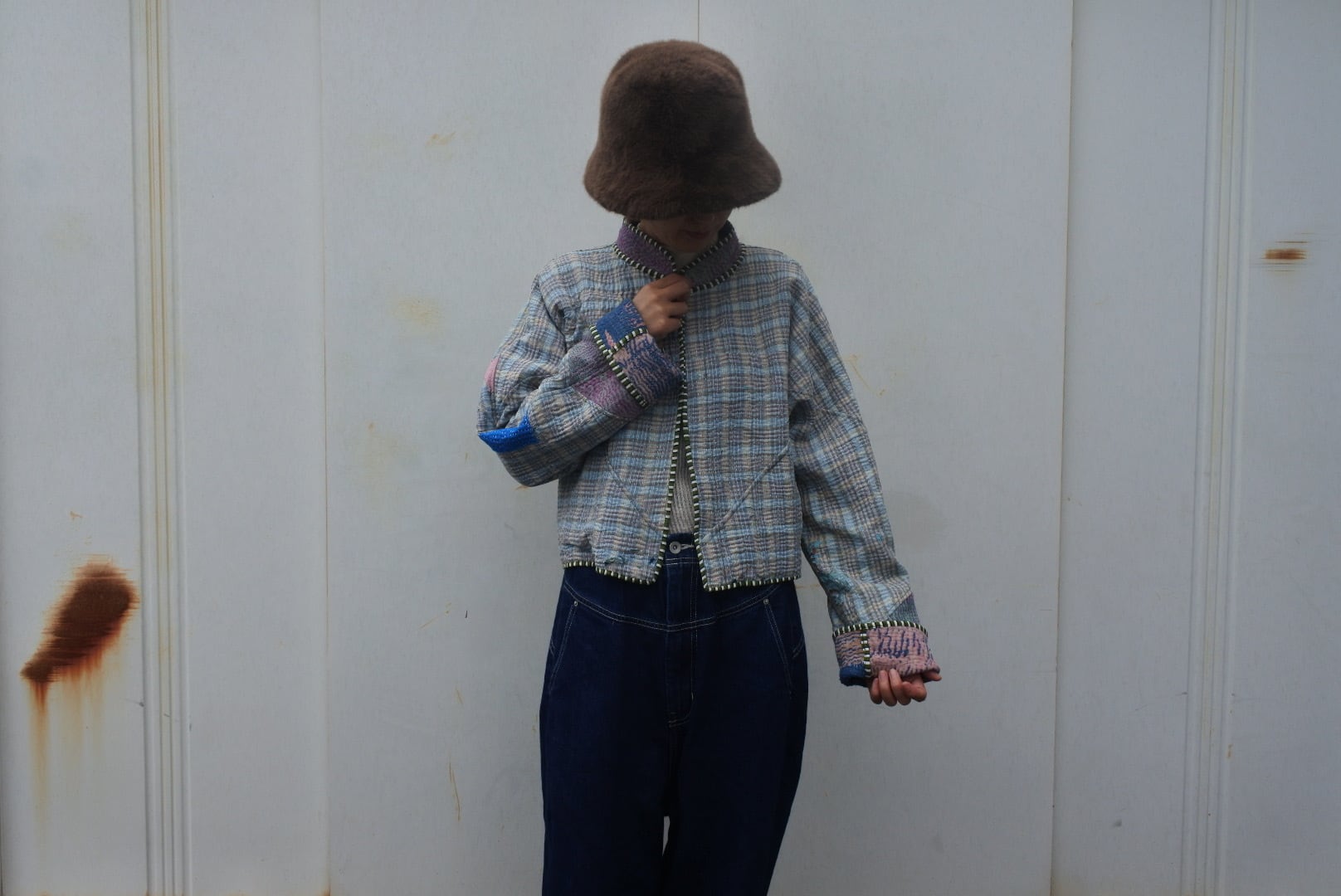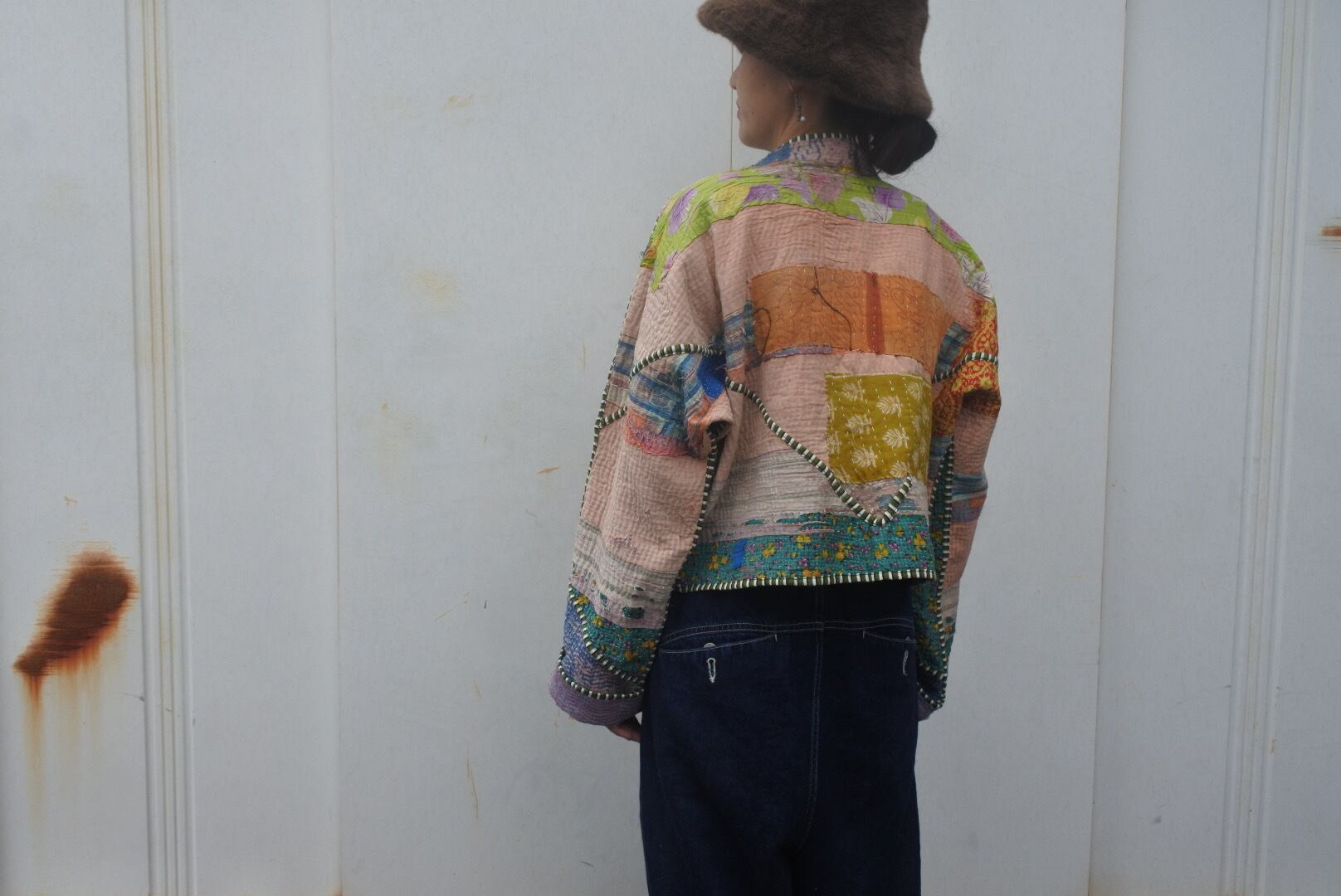 遊び心満点のパッチワークが魅力的なジャケットです。 様々な種類の花柄の生地に淡いピンクがポイントとなっています。 こちらはリバーシブル使用となっており 裏は水色チェック柄と全く雰囲気が異なり 様々な着こなしを楽しんでいただけるジャケットとなっています。 モデル160㎝ コットン100%