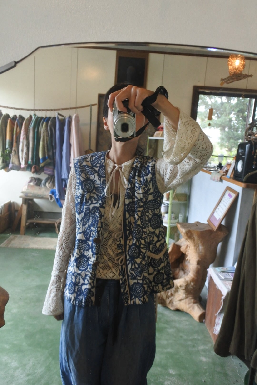 大きなウッドボタンがポイントのベスト。 インディゴでプリントされています。 コットン生地のベストは どの季節も活躍する優れものです。 これからの季節はアウターの下に着用しておくと背中が温かいのでおすすめです。 モデル160㌢ コットン100%